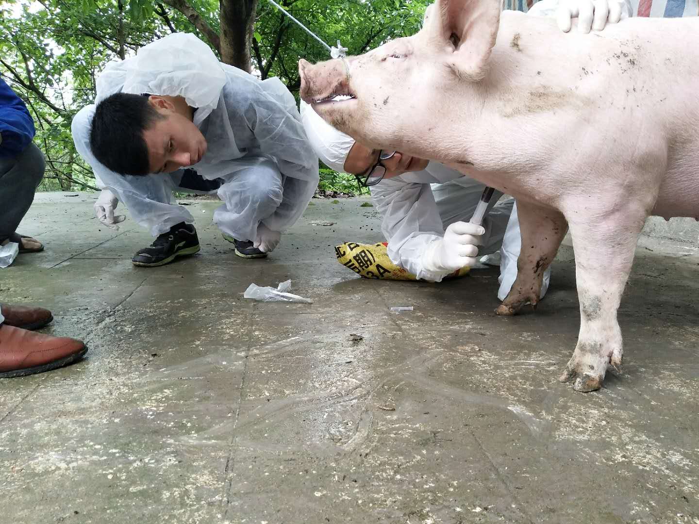 5月11日上午,在公义镇马林村4组大帝汉克家庭农场生猪养殖场,区农牧局技术人员身穿白色防护服,一人利用生猪保定器,一人在生猪头部下方采血,一头生猪仅需1-2分钟,快捷方便。